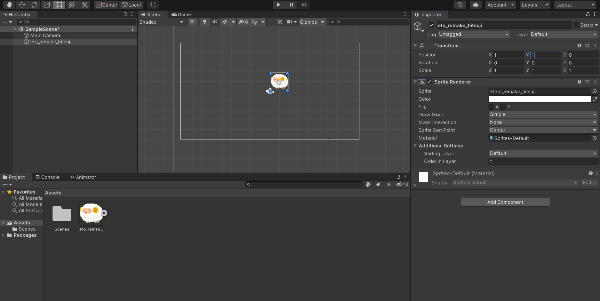 Scene上のひつじはインスペクターからも動かすことができます。試しにTransformのpositionのx座標とy座標を1に動かしてみましょう。