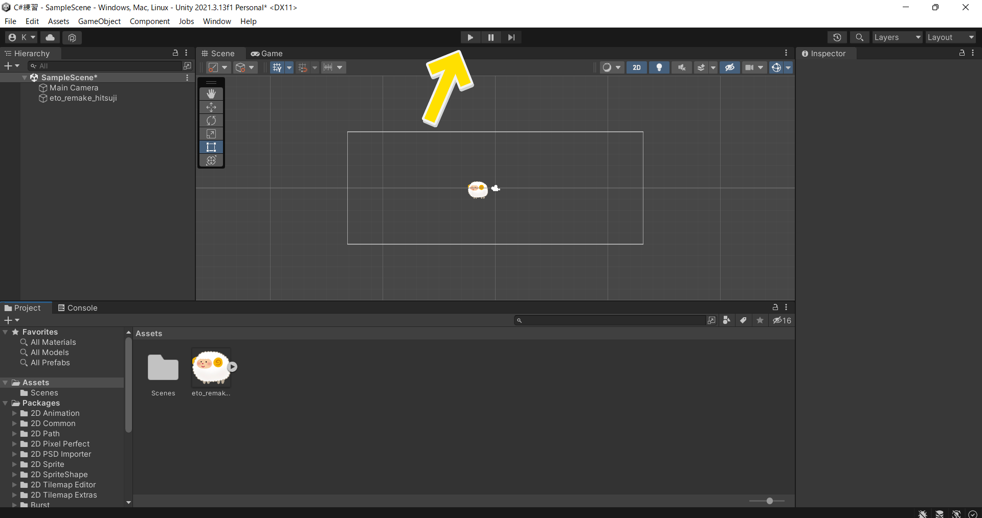 それでは、この羊がどのように動くのか確認してみましょう。上の再生ボタンを押してゲームを起動します。