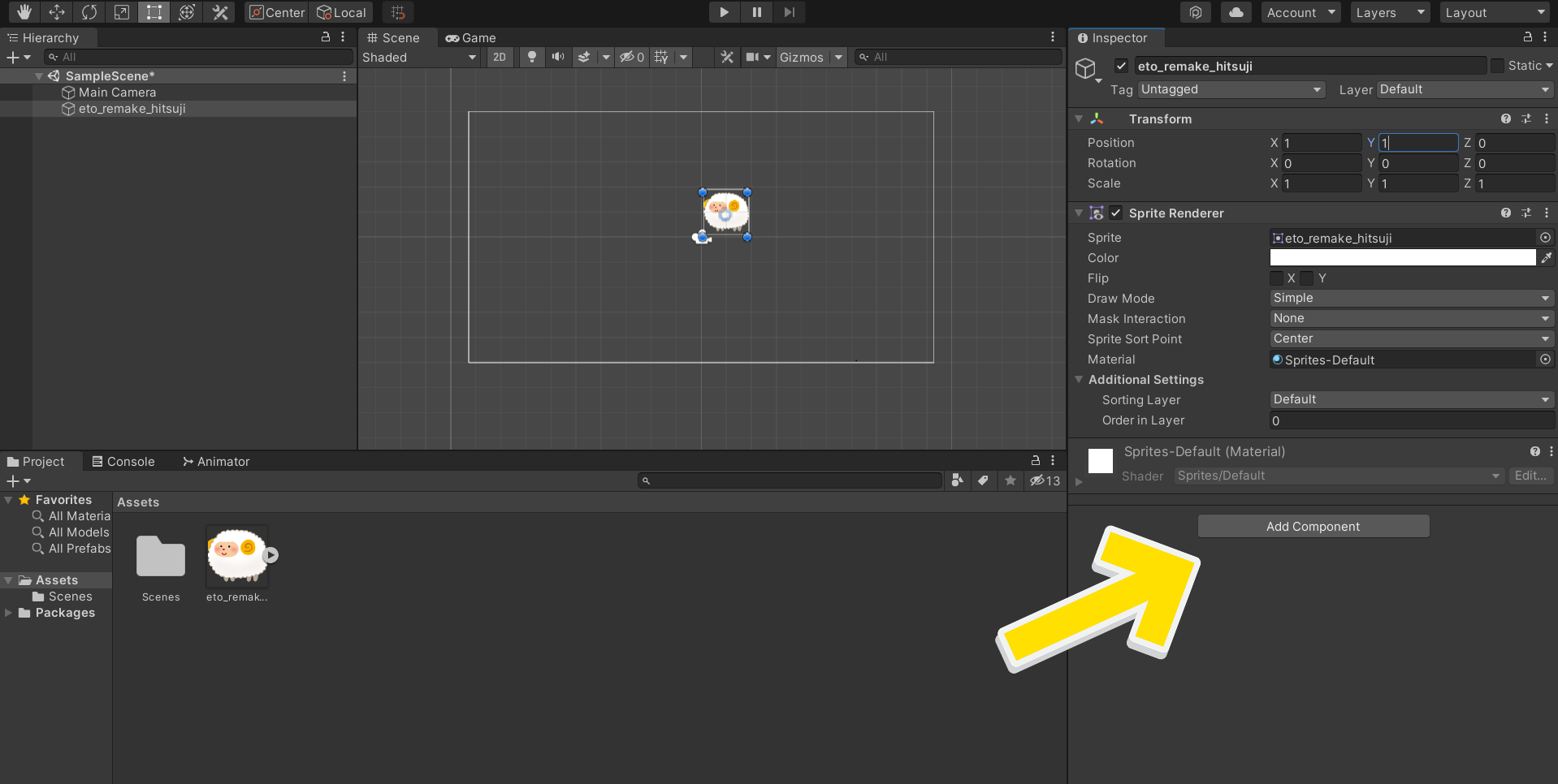 さて、今ひつじにはTransformとSprite Rendererというコンポーネントがついていますが、これだけではゲームを作っていくのには物足りません。