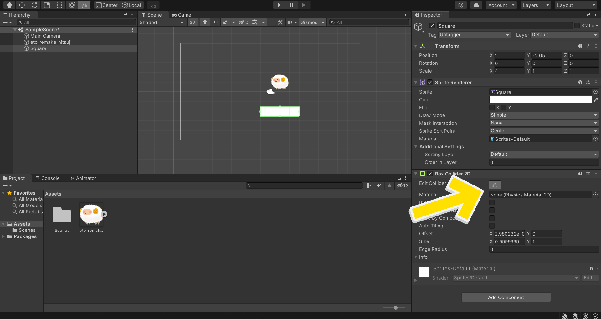 おっと、ひつじがすり抜けていきました。これは、ボックスのほうに当たり判定がついていないからですね。それでは、ボックスのほうにも当たり判定を付けていきましょう。ヒエラルキーで「Square」を選択した後、AddComponentを選び「BoxCollider2D」と入力して出てきたものを入れてください。