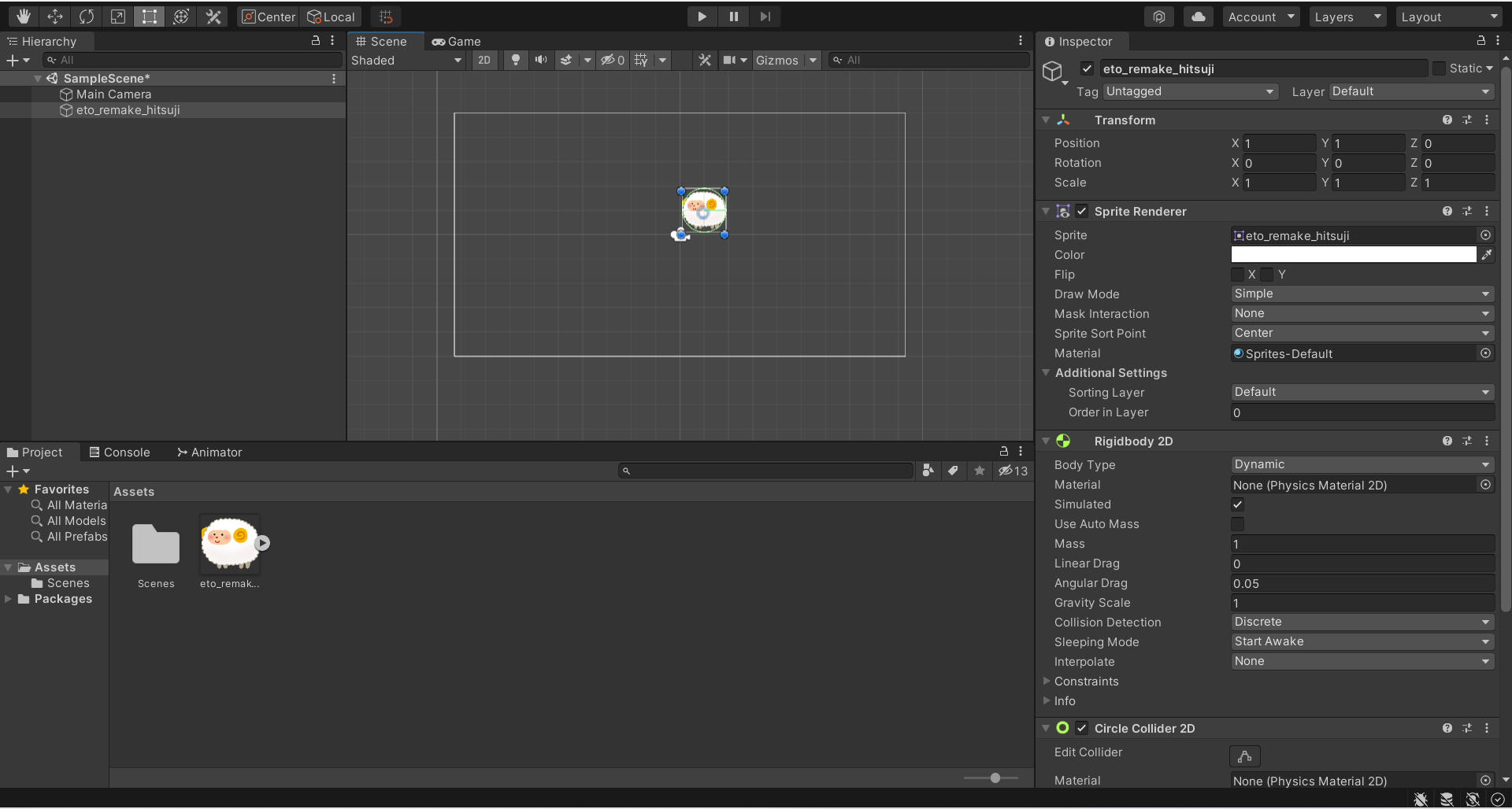 色々出てきましたね。今回は、ひつじに物理演算の処理を追加していきます。2つのコンポーネントを追加したいので、AddComponentの検索のところに「rigidbody2D」と「Circle Collider 2D」と打ち込んで、出てきたものをクリックしてみてください。
