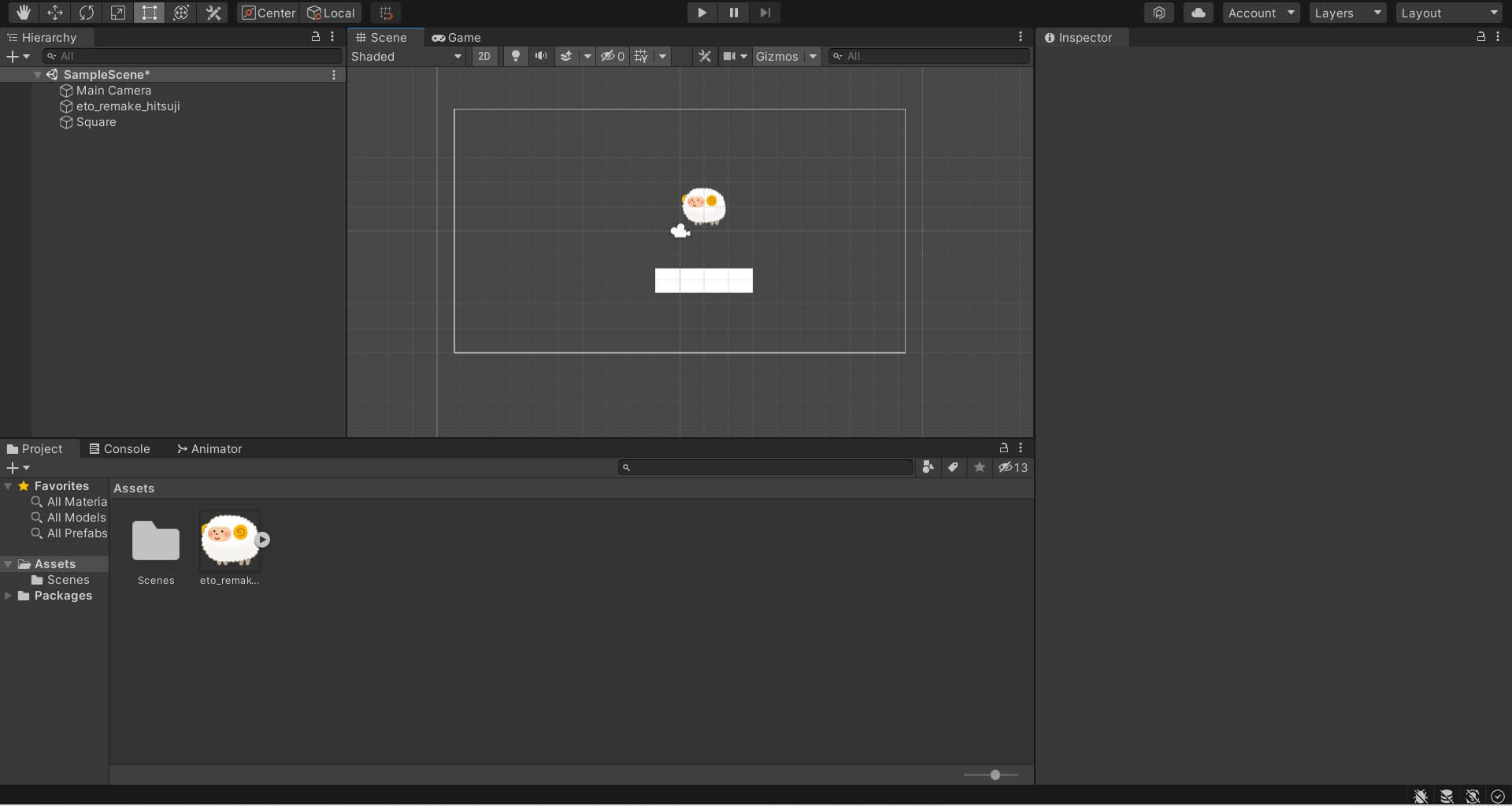 2D Object < Sprites < Square と選択してください。すると、新しく四角いブロックができたはずです。このブロックをひつじの下に配置してみましょう。それと、ひつじを受け止められるようにボックスの横を少し長くしておきましょう。長くするときはTransformのScaleをいじると長くできます。