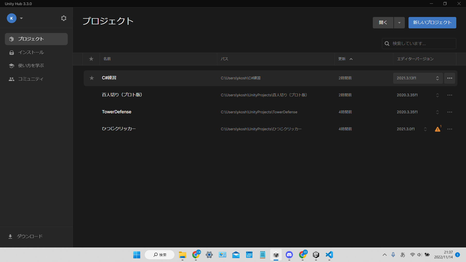 Unity Hubを開き、右上のの新しいプロジェクトを押します。