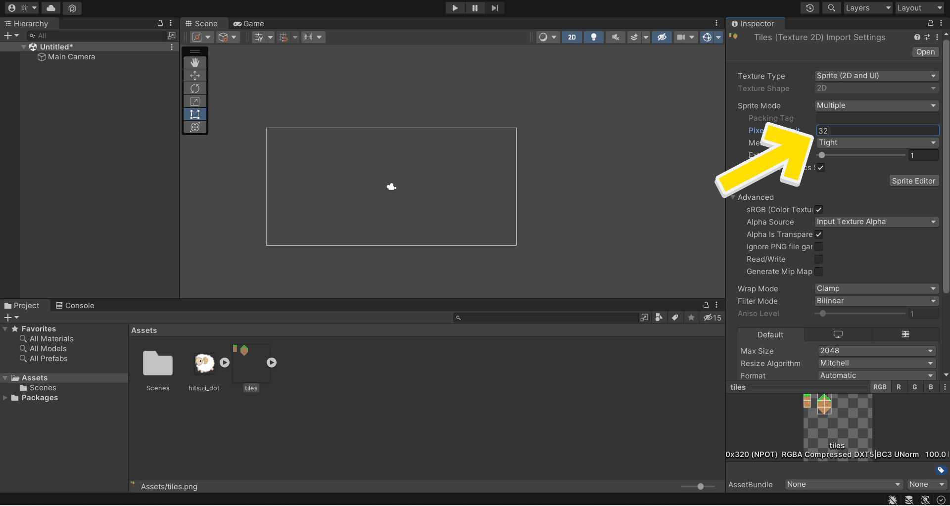 そして、Tilemapに合わせるため、InspectorからPixels Per Unitの数値を100から32に変更してください。