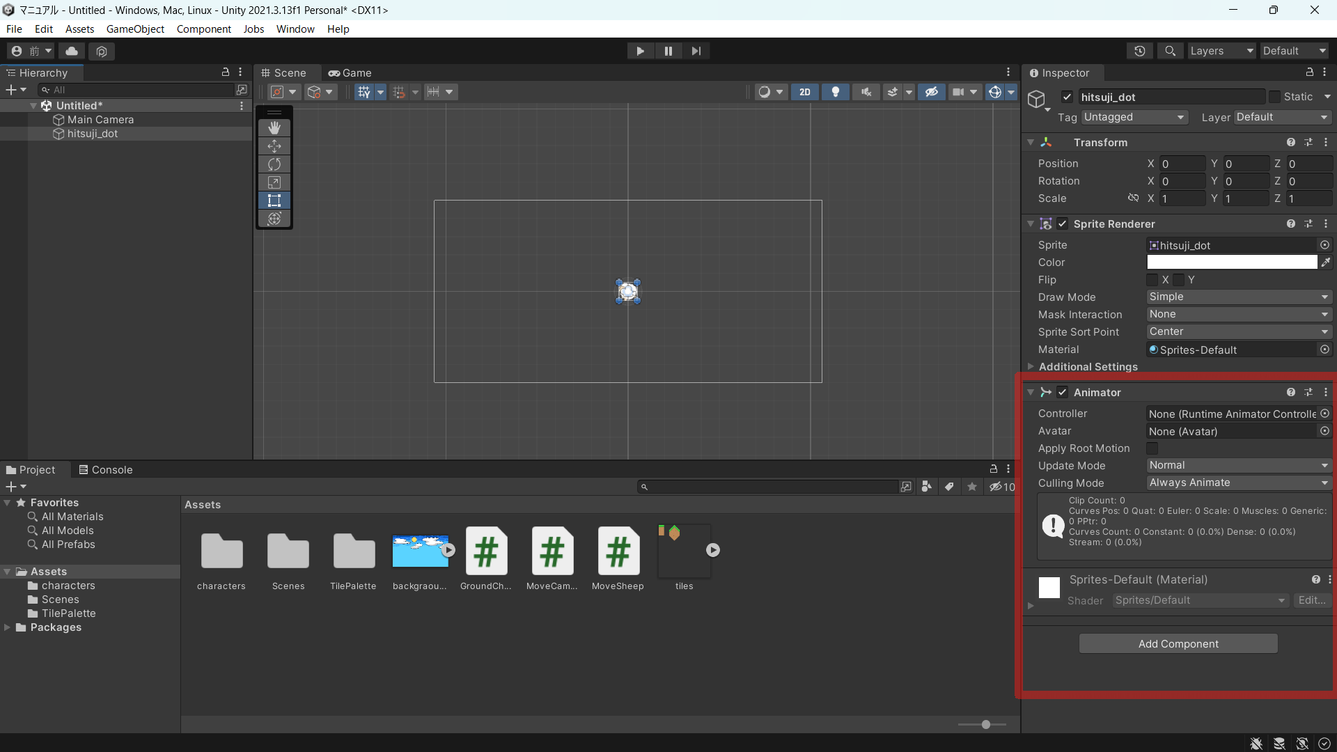 Animationタブを触るときは基本的にそのアニメーションを作りたいオブジェクトを選択状態にしておくことが必要です。