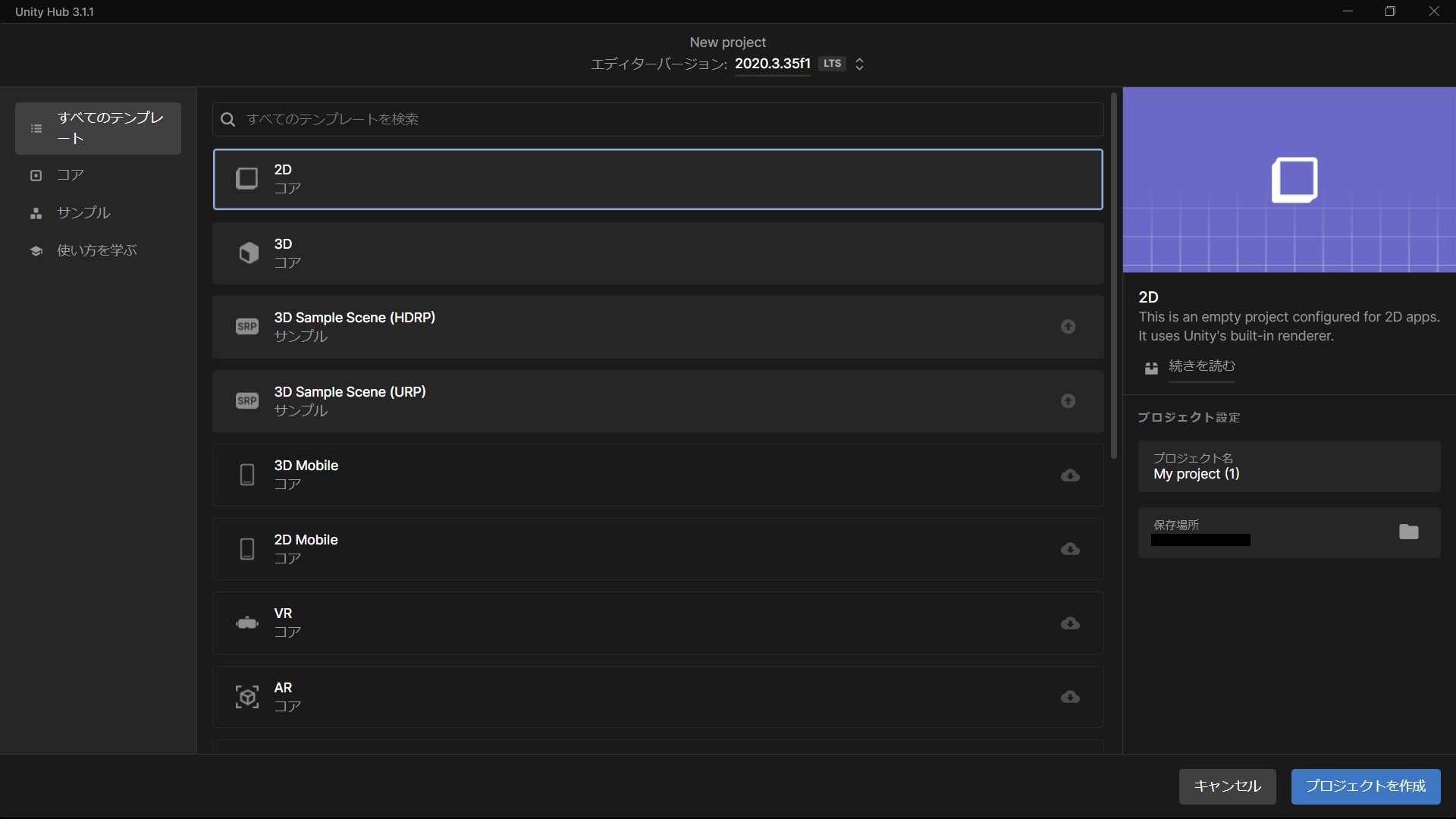 このような画面になります。たくさんのテンプレートがありますが、今回は一番基本的なテンプレート2Dを選択します。