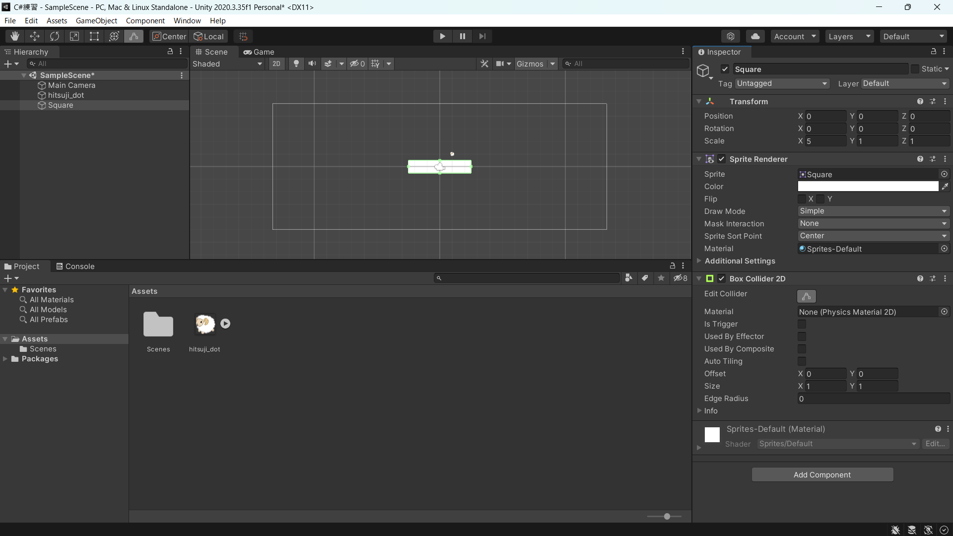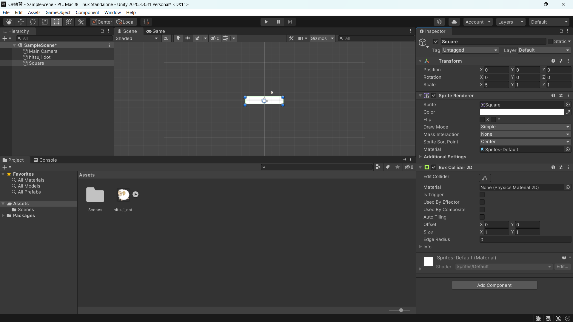 ヒエラルキーで「Square」を選択した後、 AddComponent を選び「BoxCollider2D」と入力して出てきたものを入れてください。
