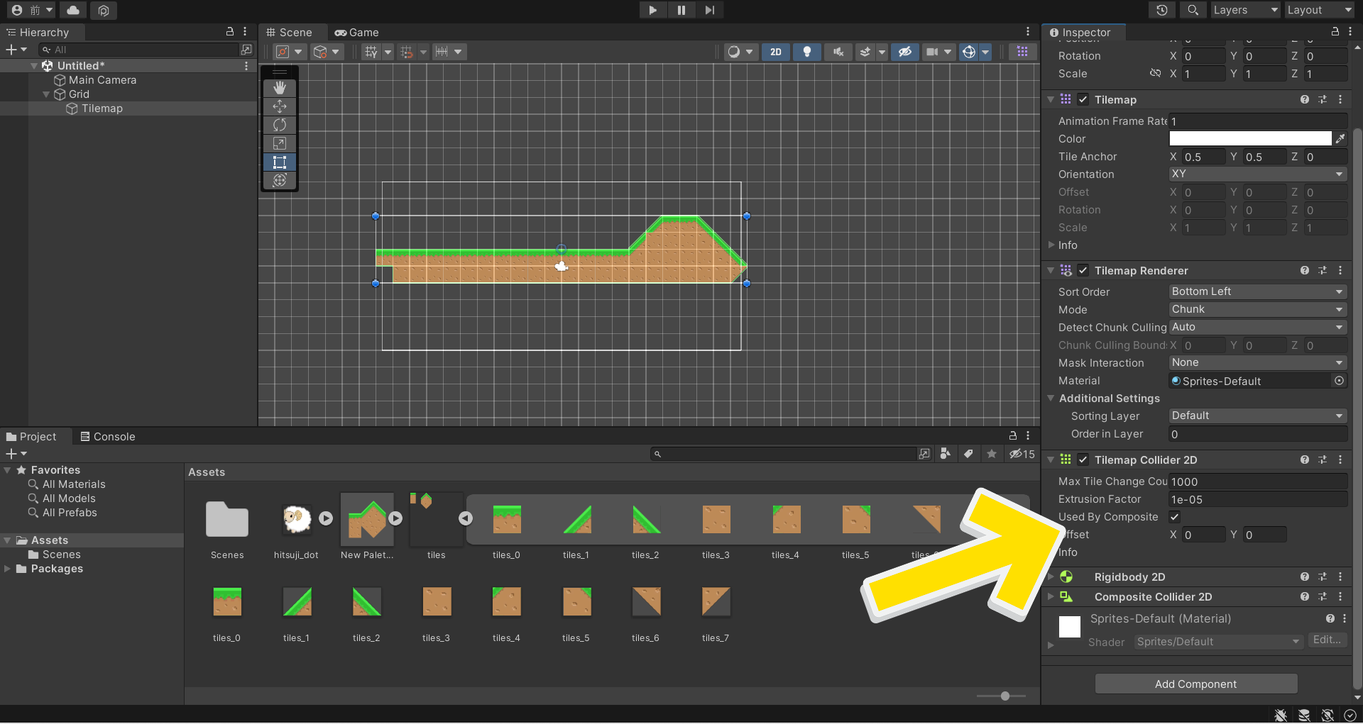 その後、tilemap collider 2Dのused by composizeにチェックを入れると当たり判定がまとまります。