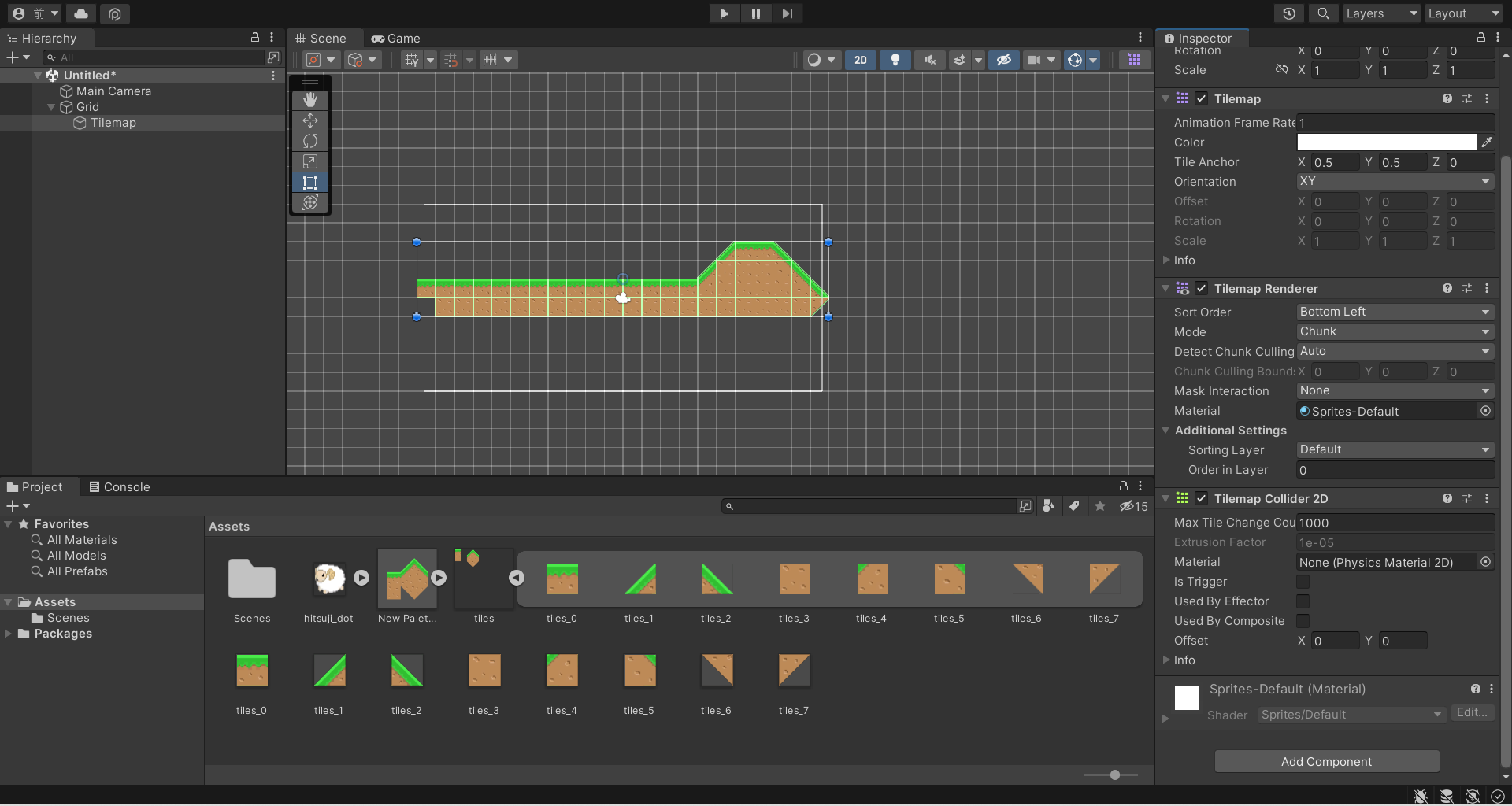ヒエラルキーを右クリックして、2D object>Tilemap>Rectangular を押してください