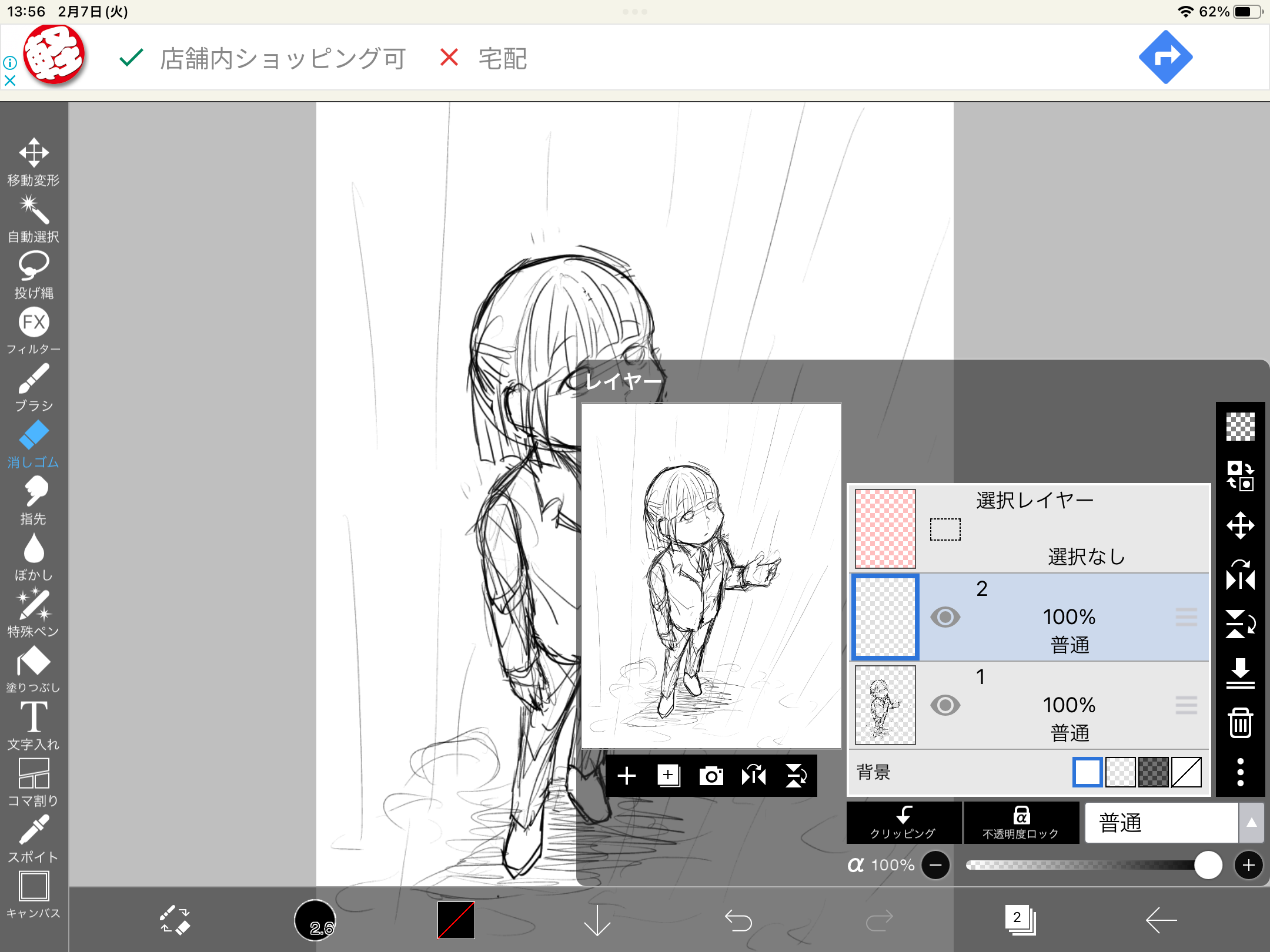 下書き(ラフ)をもとに線画をするためのレイヤーを追加します。