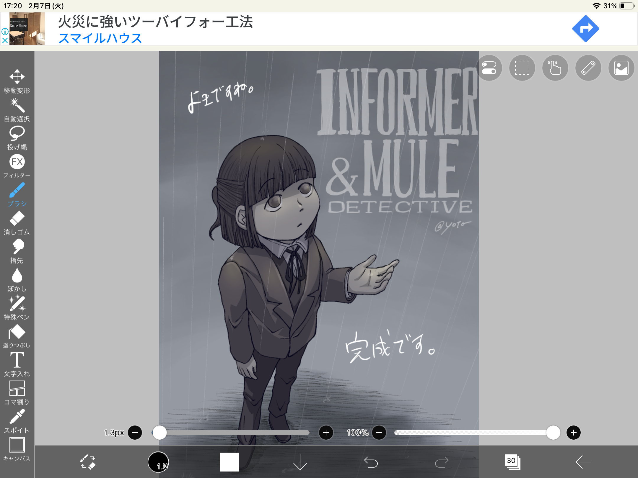 ↓の画像では線画レイヤーの下に画面を全て塗りつぶしたレイヤーを入れ、背景色を決めています。(背景色を決める前の画像を撮り忘れました。。。謝罪。)